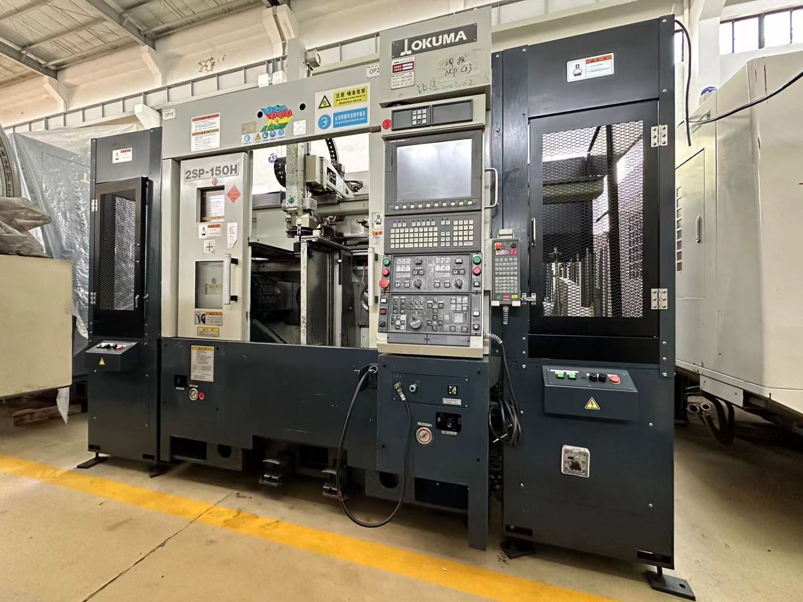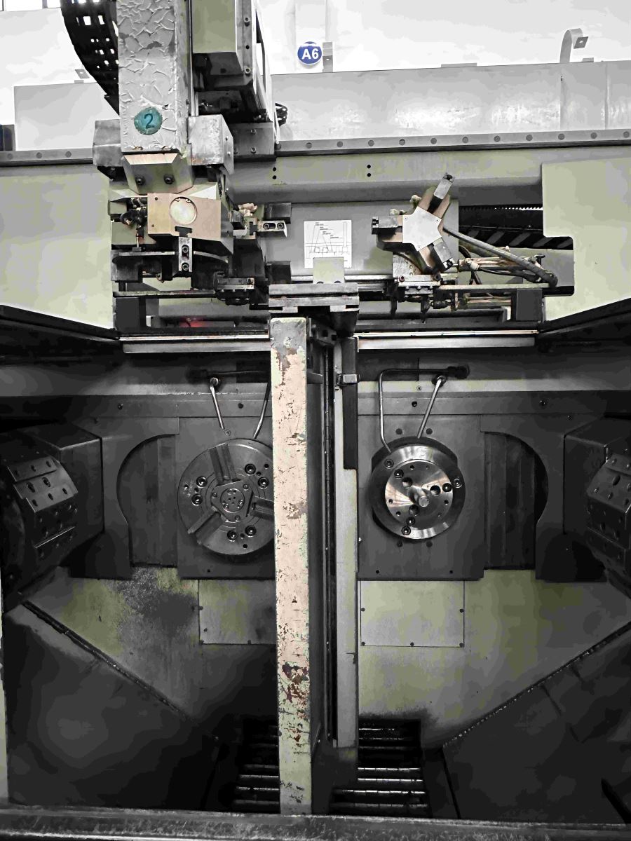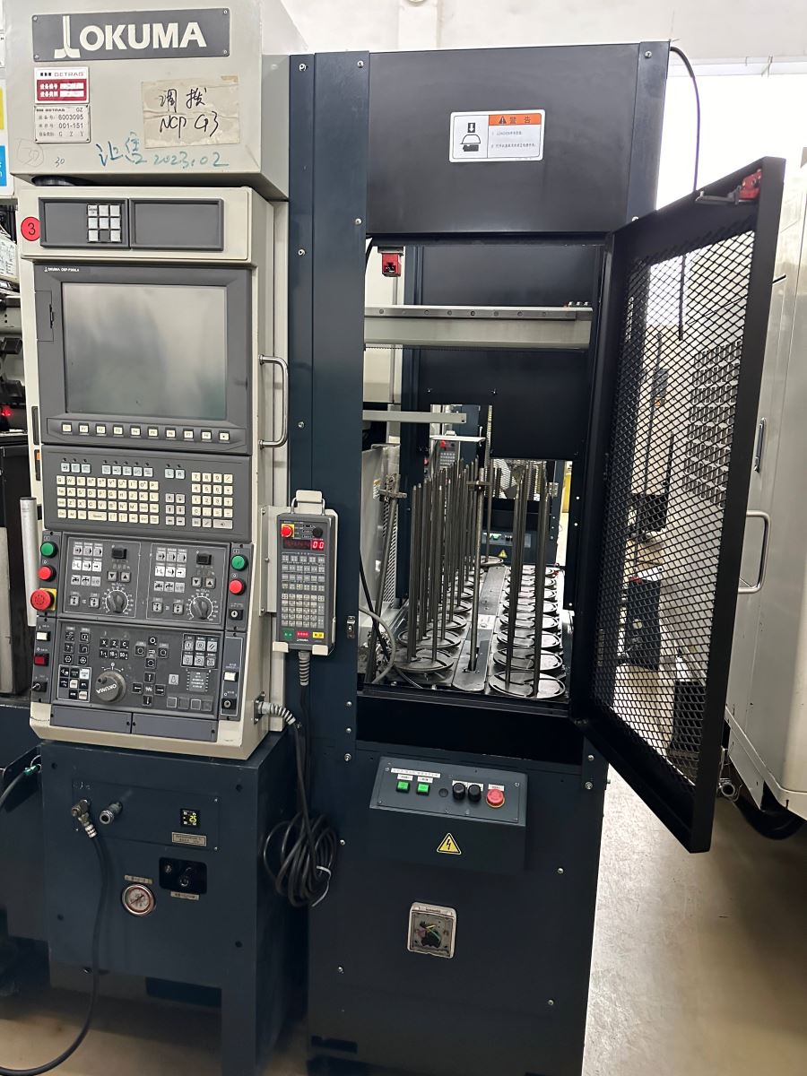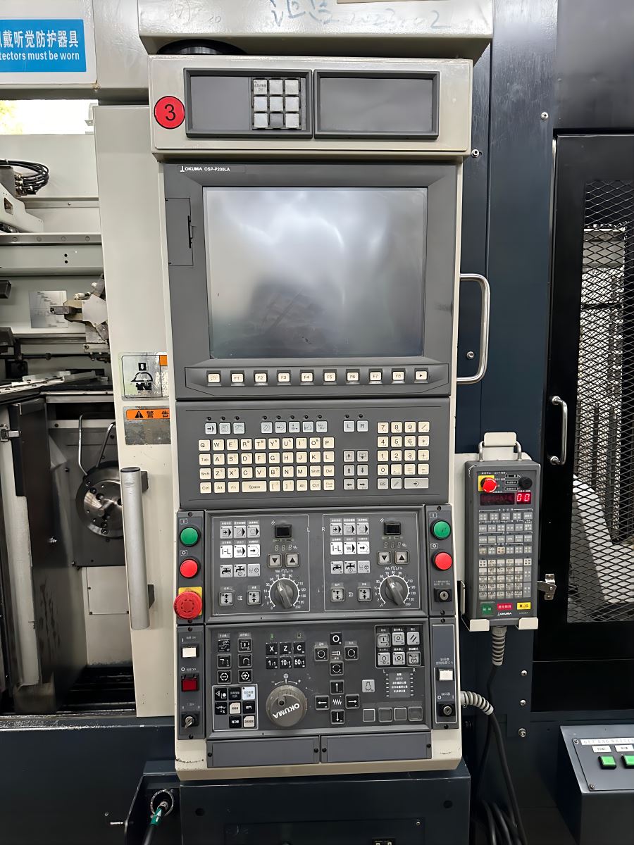 日本大隈双主轴双刀塔数控车床 系统:OKUMA OSP-P200LA 主轴转数:4500rpm 行程:X 150mm * Z 155mm 刀柄:25mm,镗杆柄直径:φ40 最大工件尺寸:φ150*80L 机械手自动装料
