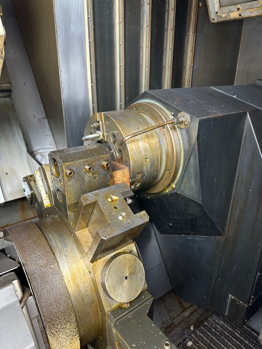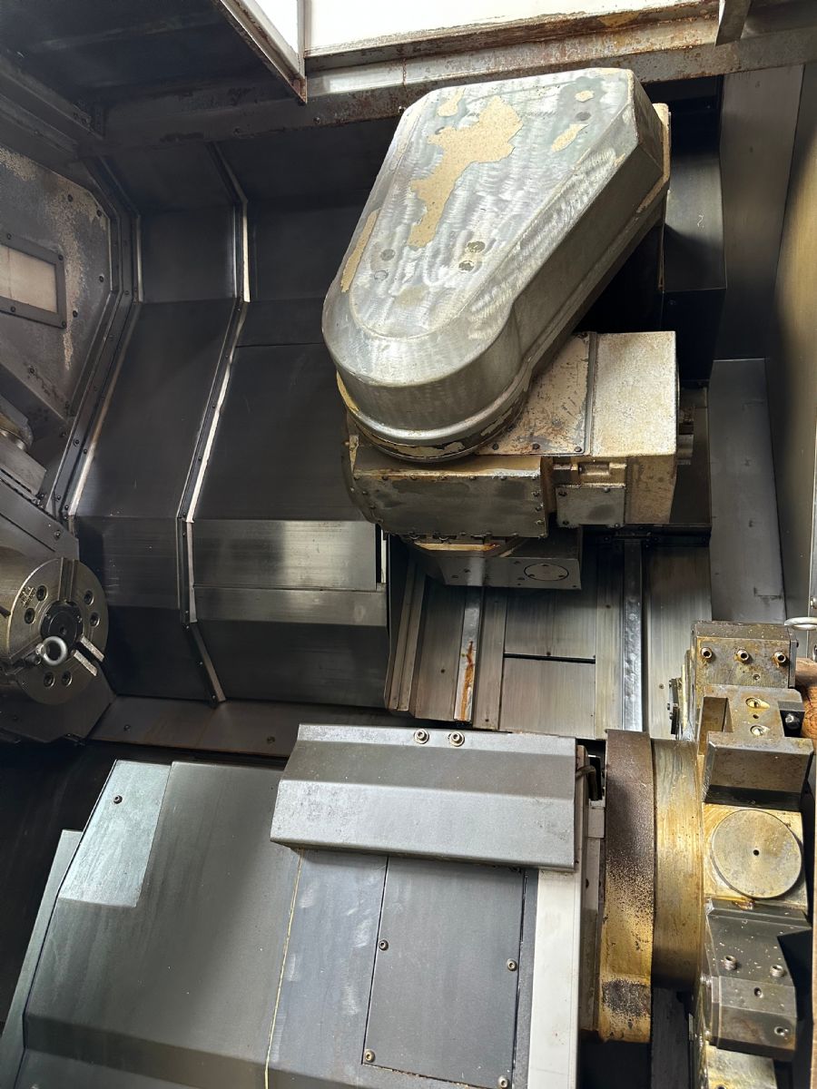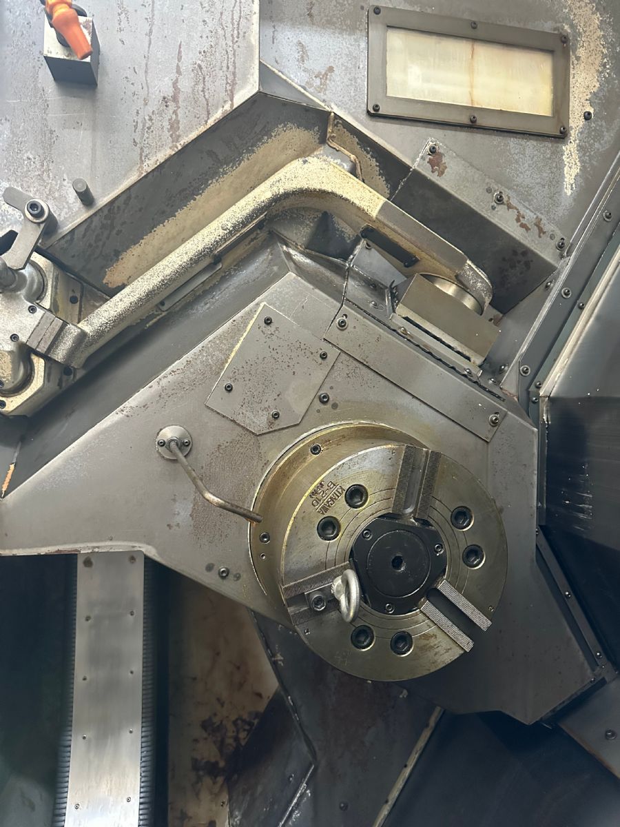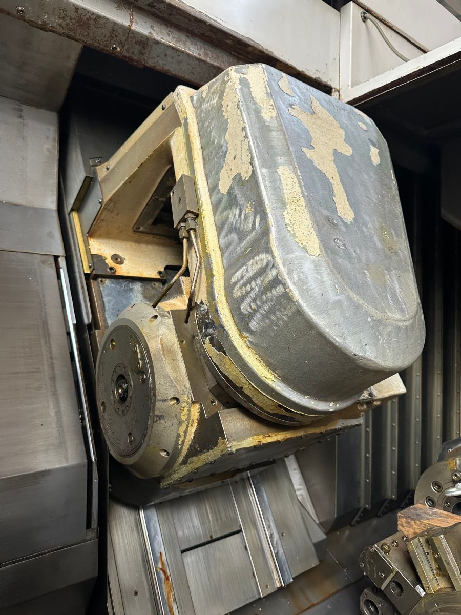 系统:OSP P200L 主轴转速:5000rpm X轴行程:XA:475mm XB:160mm Z轴行程:ZA:1170mm ZB:1155mm W轴:1180mm Y轴:-80mm~+80mm C轴:360°(最小分割角度0.001°)B轴分度:1° 铣头回转速度:6000rpm 刀方:25mm、镗杆直径:φ40 刀库:84把 刀柄:HSK-A63 下刀塔:12工位、刀方:25mm、镗杆直径:φ40 振摆:φ530 加工直径:550mm