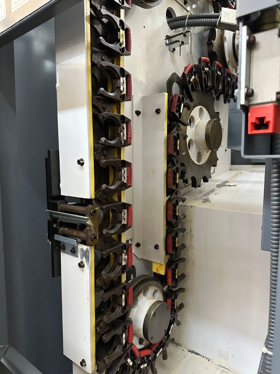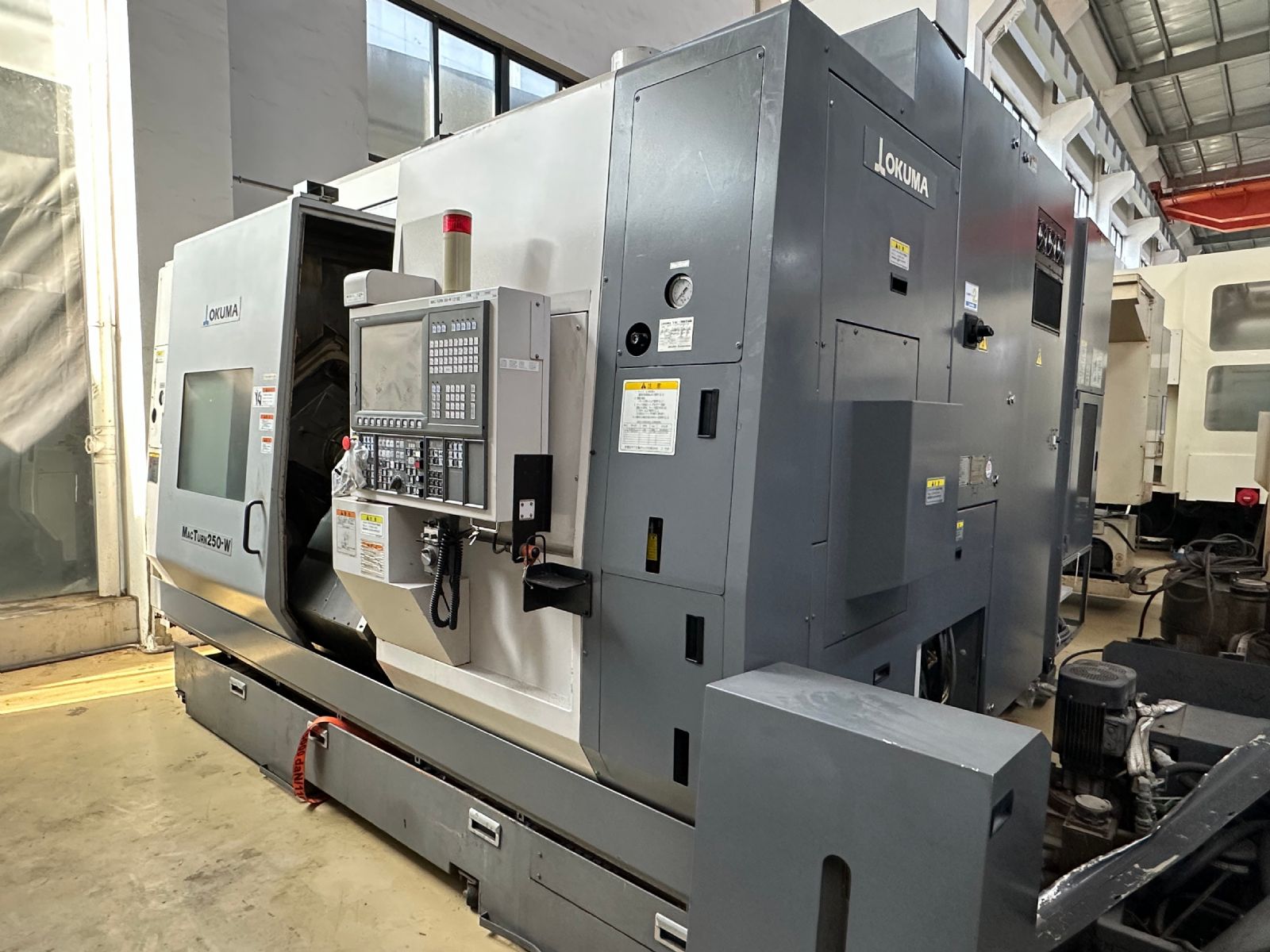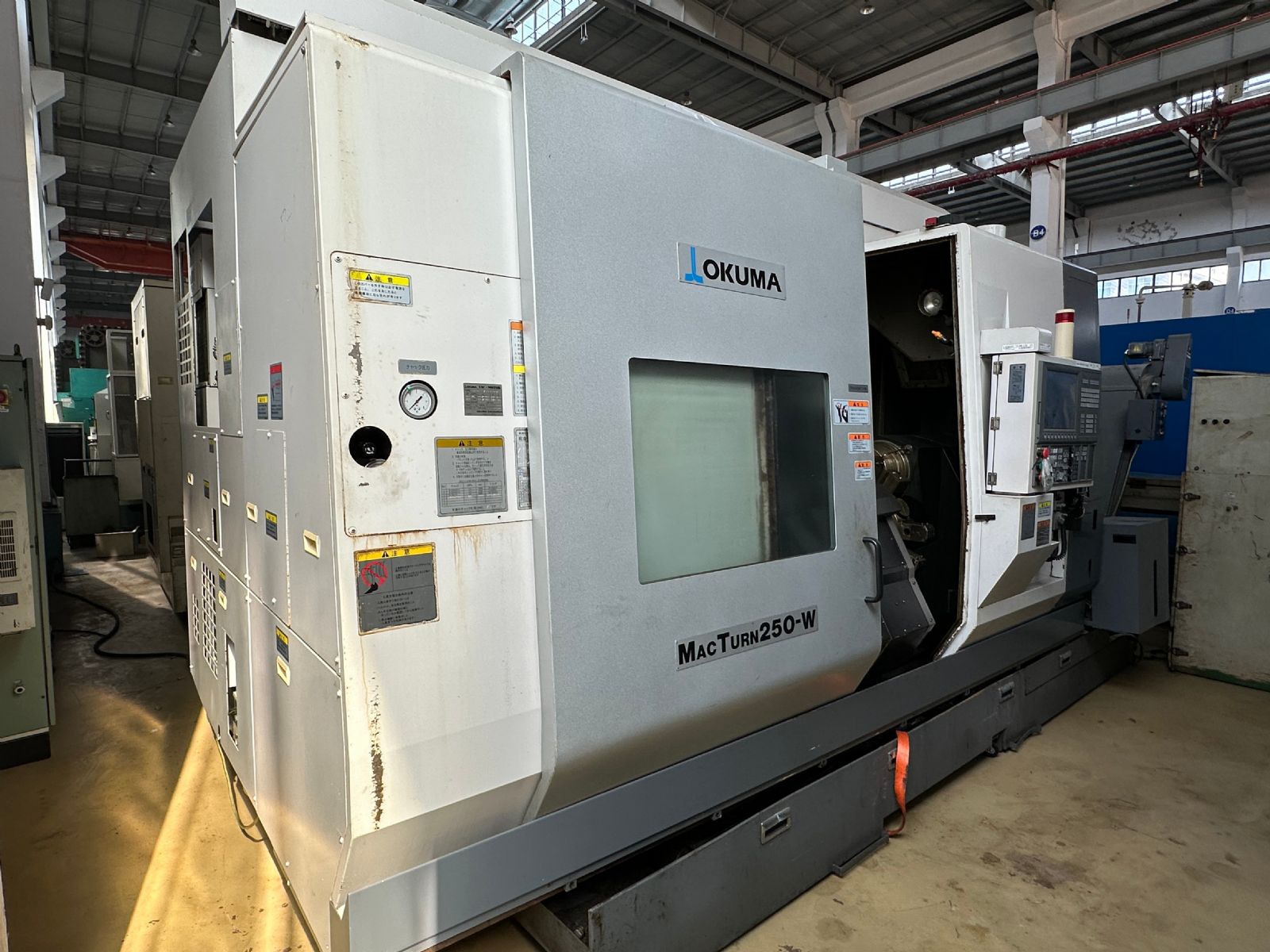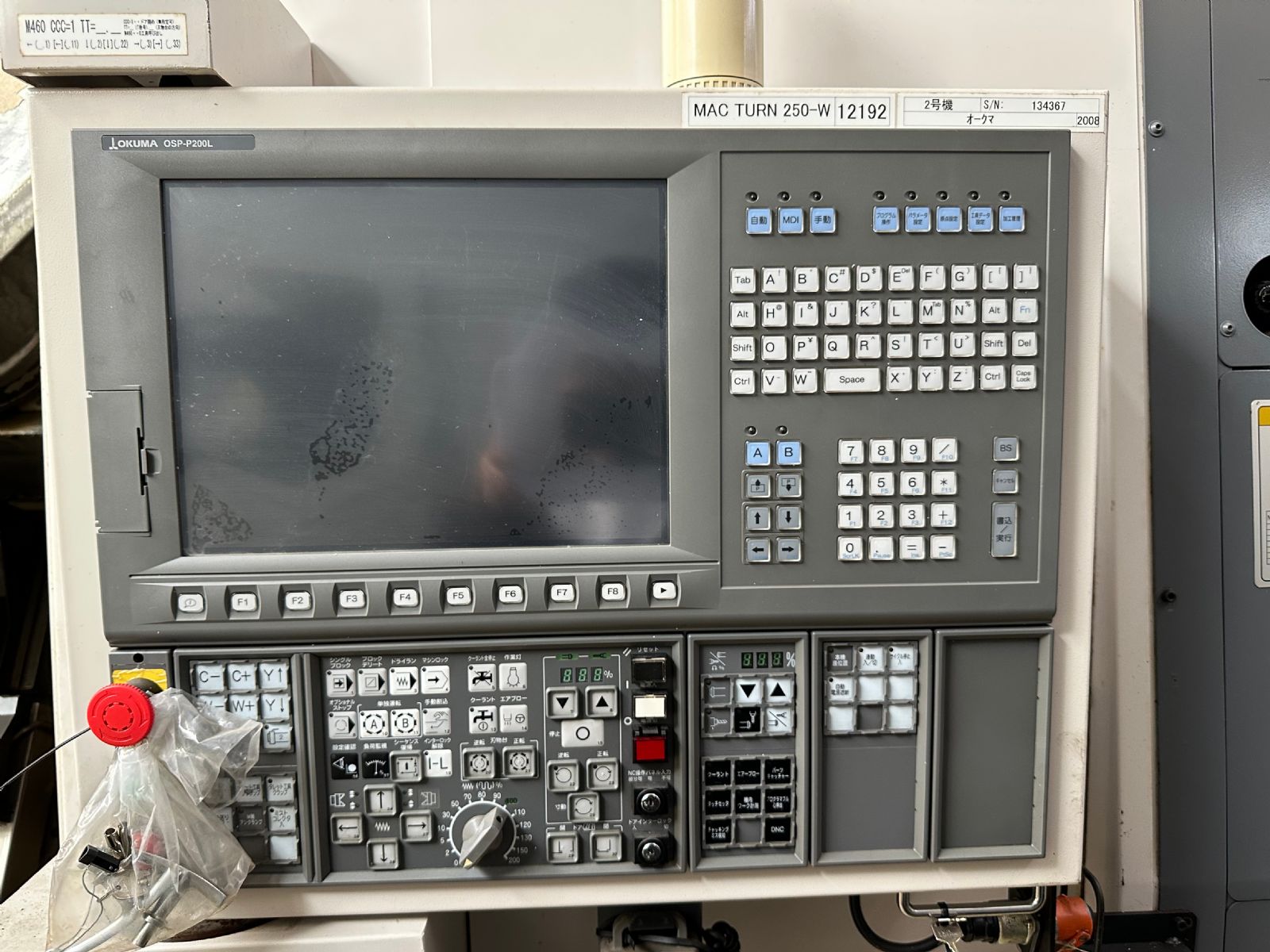 系统:OSP P200L 主轴转速:5000rpm X轴行程:XA:475mm XB:160mm Z轴行程:ZA:1170mm ZB:1155mm W轴:1180mm Y轴:-80mm~+80mm C轴:360°(最小分割角度0.001°)B轴分度:1° 铣头回转速度:6000rpm 刀方:25mm、镗杆直径:φ40 刀库:84把 刀柄:HSK-A63 下刀塔:12工位、刀方:25mm、镗杆直径:φ40 振摆:φ530 加工直径:550mm